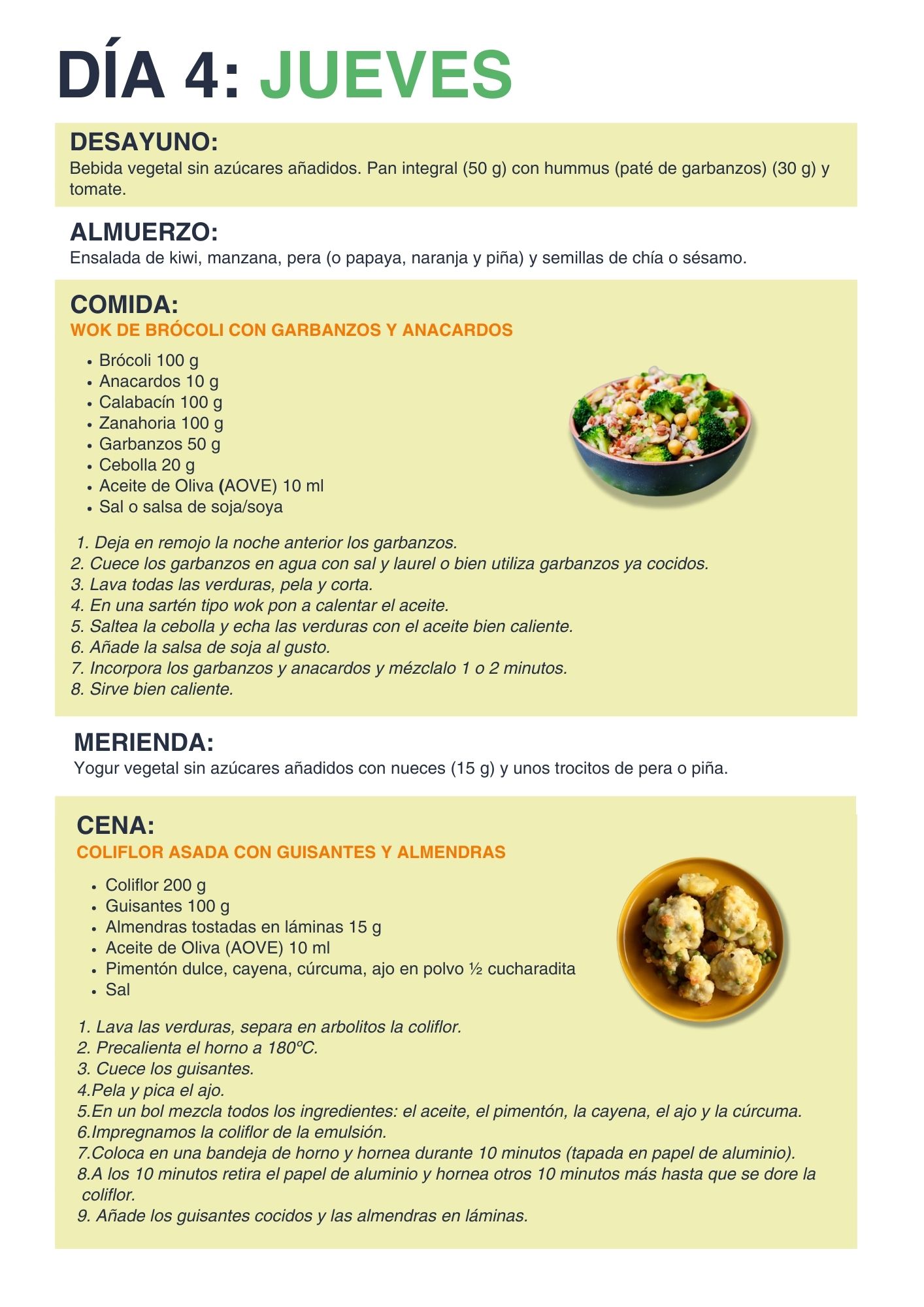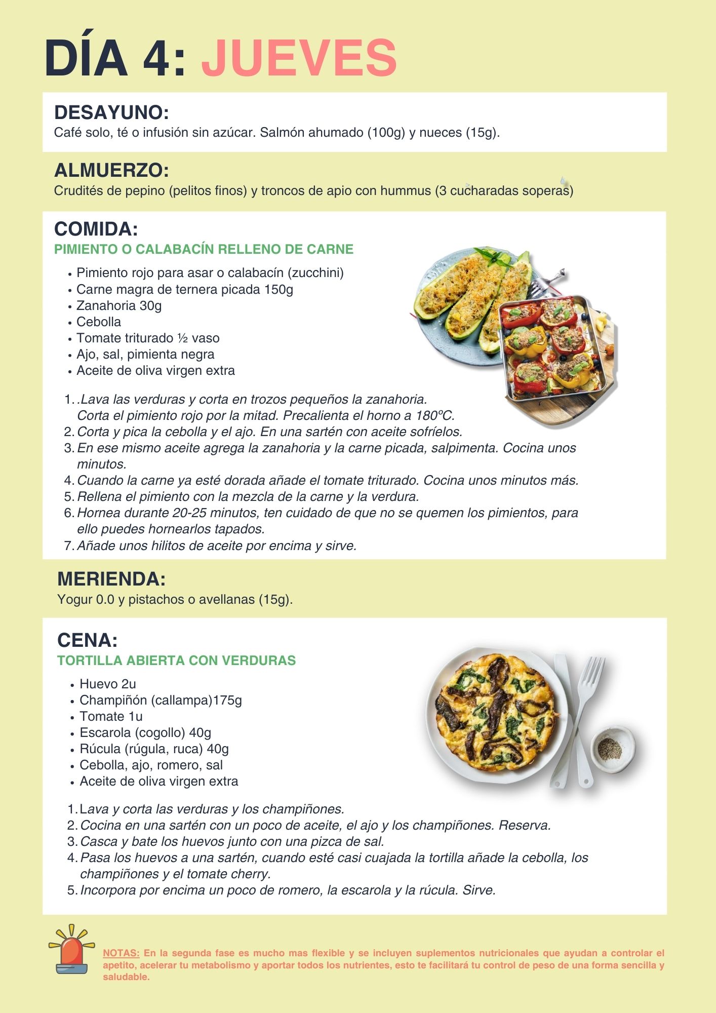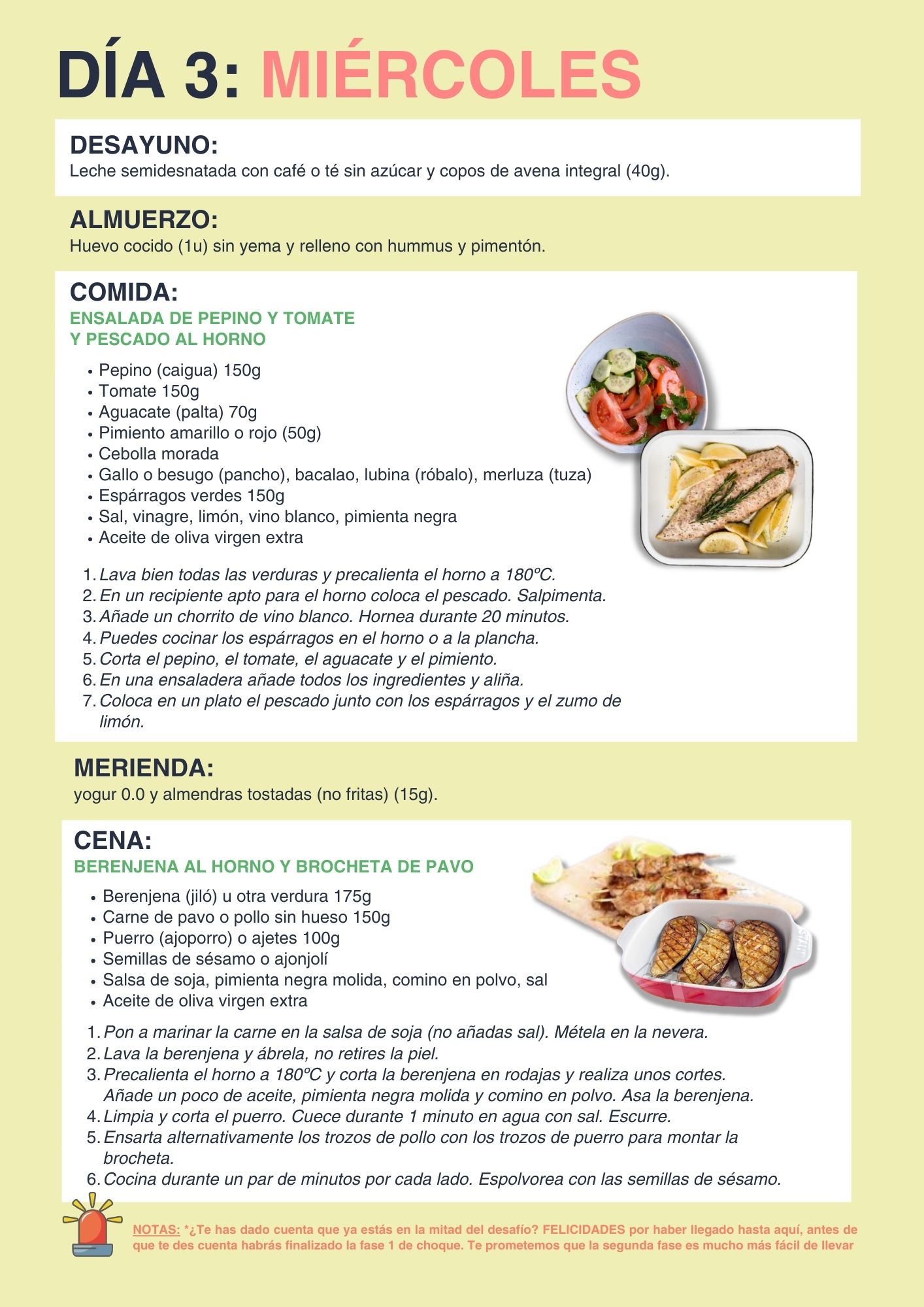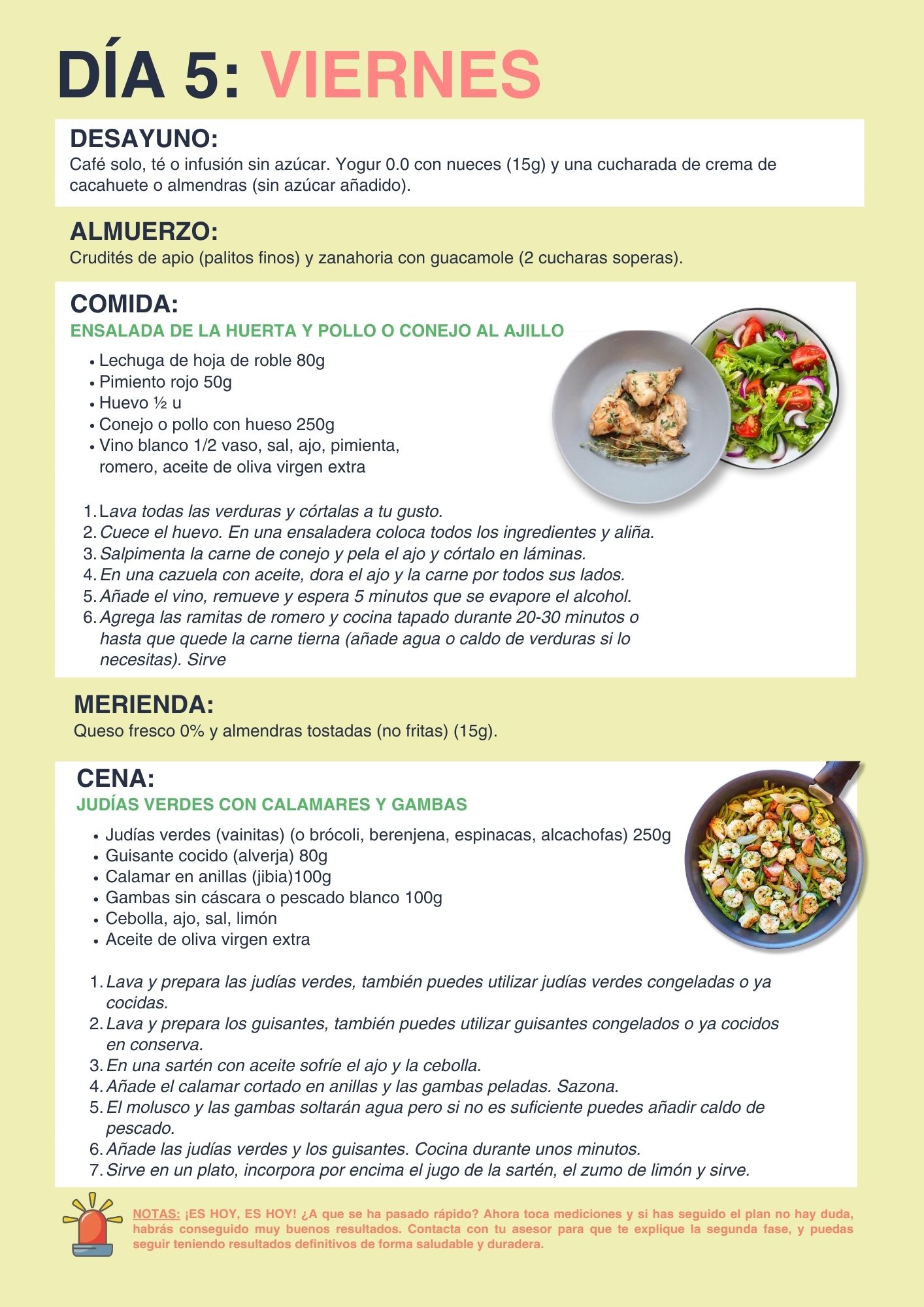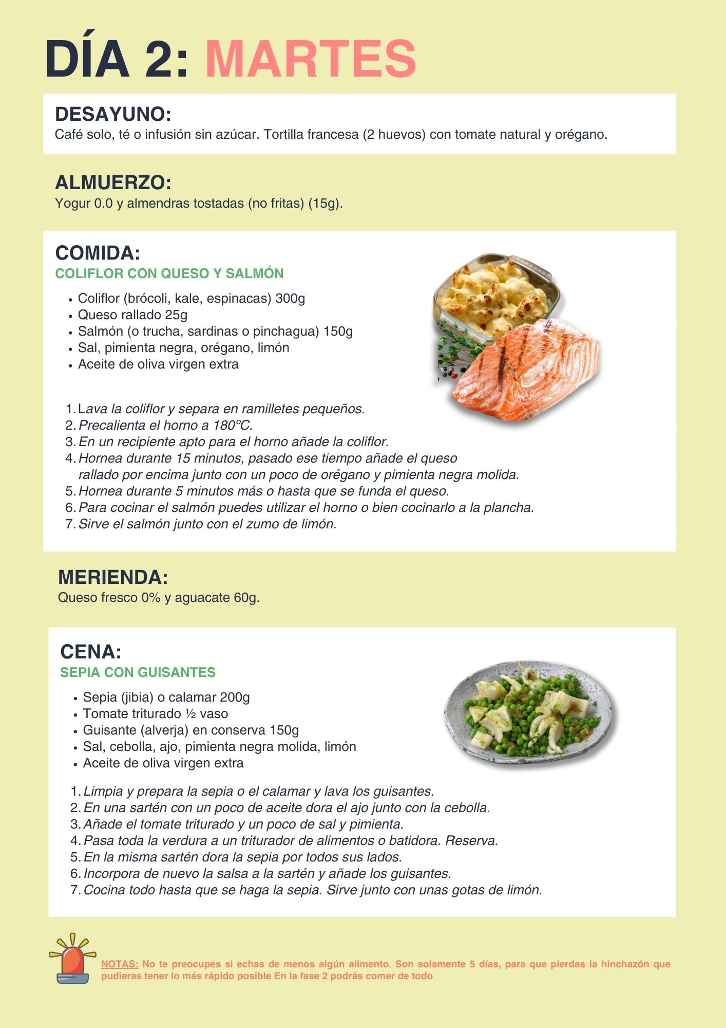Dia 2 superado y espero que con éxito. Estoy segur@ de que hoy todo ha resultado más sencillo que ayer… ya vais cogiendo el hábito, la costumbre… y seguro que os vais encontrando mejor. Probablemente, además de notaros con más energía, os estéis empezando a ver más deshinchadas. Si os ayuda, podéis mandarme las fotos de las comidas y así puedo revisarlas y ayudaros mejor.